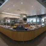 The second floor houses a student cafeteria with 10 serving platforms offering various cuisines and made-to-order meals. Its Distributed Dining layout places seating throughout the serving stations for a more social dining experience. A central salad station highlights fresh, healthy options, while a special diets platform accommodates students with allergen-free and gluten-free dietary needs.